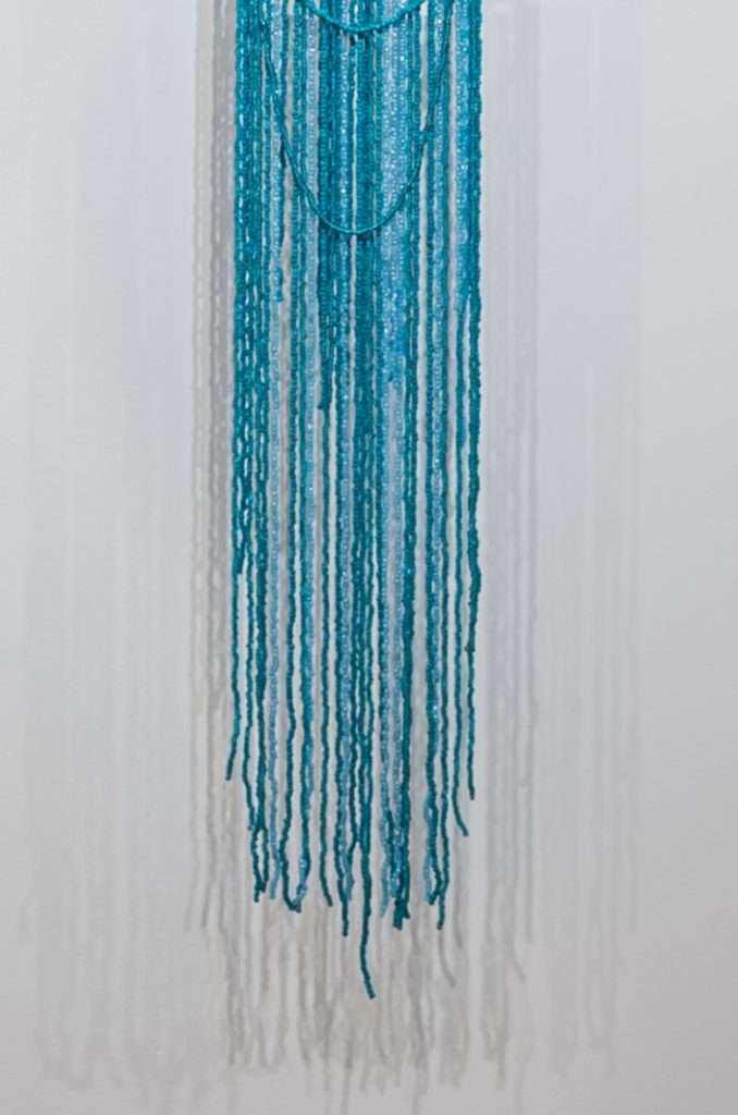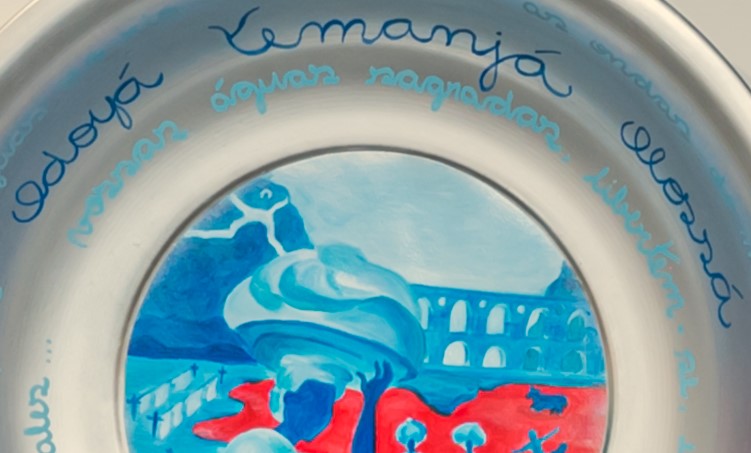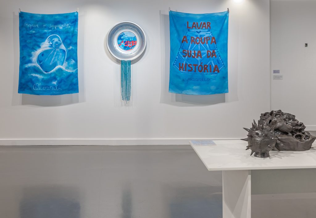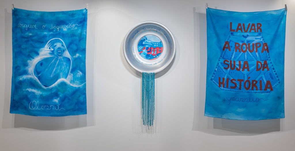 A obra de Mariana Maia reverencia Olossá, orixá das águas salobras das lagoas, que se perdeu na travessia atlântica entre África e Brasil e no desaparecimento das cinco lagoas que constituíam esse solo pantanoso do Centro do Rio. A divindade vem à superfície da Lagoa do Boqueirão, denunciando apagamentos e histórias enterradas. Varais, pregadores de roupas, tecidos, uma bacia de alumínio e miçangas ativam um imaginário ligado às atividades performadas pelas mulheres negras escravizadas no século XVIII, quando da construção deste jardim supostamente pacificado.