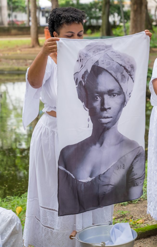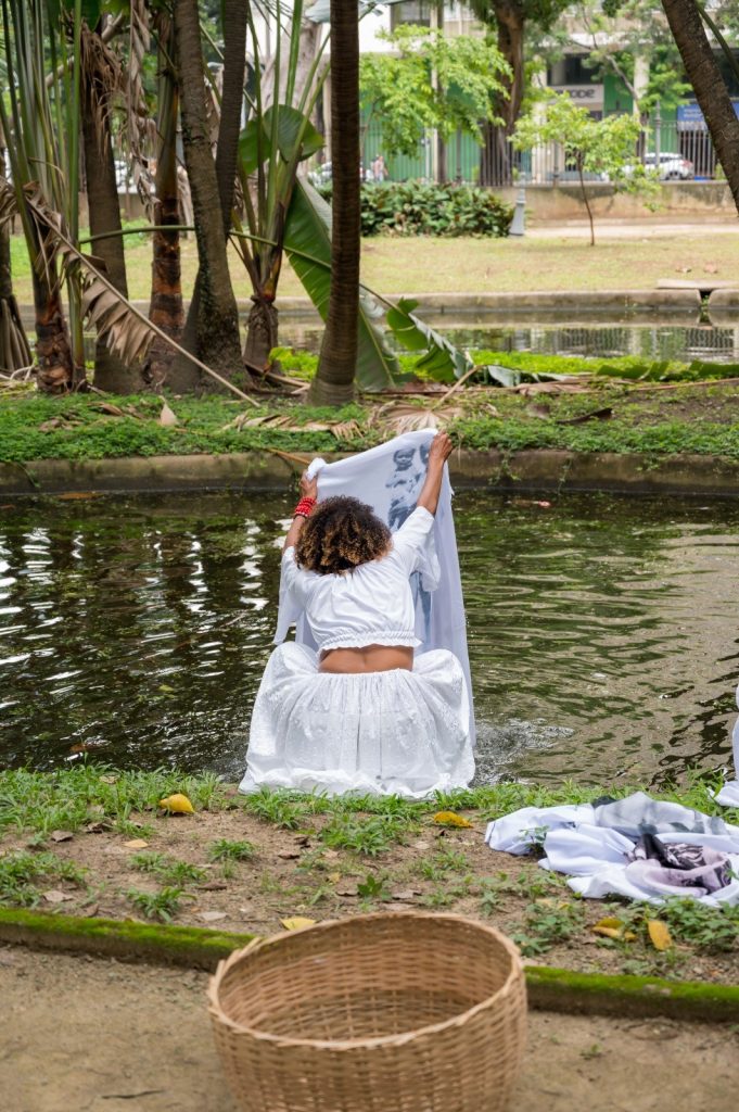 Além de Olossá, a artista realizou também a performance Trouxa corpo. Junto a um grupo de artistas negras, evocou a presença de Marielle Franco, Luisa Mahin, Tereza de Benguela e Dandara dos Palmares. No córrego do Passeio, lavaram bandeiras brancas com imagens dessas mulheres históricas, fazendo justiça e lembrando que o Brasil foi construído com o sangue e o trabalho de pessoas negras sistematicamente silenciadas. O grito de Mariana não nos deixa esquecer que a roupa suja não se lava em casa, mas em público.